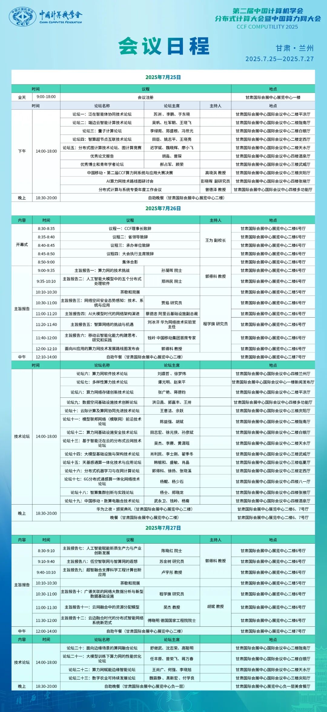 第二届中国计算机学会(CCF)分布式计算大会暨中国算力网大会(CCF Computility 2025)将于2025年7月25日至27日在中国甘肃兰州市举行,会议规模预计1400余人。本次会议由CCF主办,CCF分布式计算与系统专委会与兰州大学共同承办。会议主题为“算力网:新质生产力背景下的分布式系统”,旨在为分布式系统和算力网相关的从业者提供最专业的学术研讨、技术交流和成果展示的平台。CCF Computility 2025为大家准备了11场由院士等顶级专家带来的主旨报告,23场技术论坛(120位特邀报告)。目前会议注册通道已经开放。