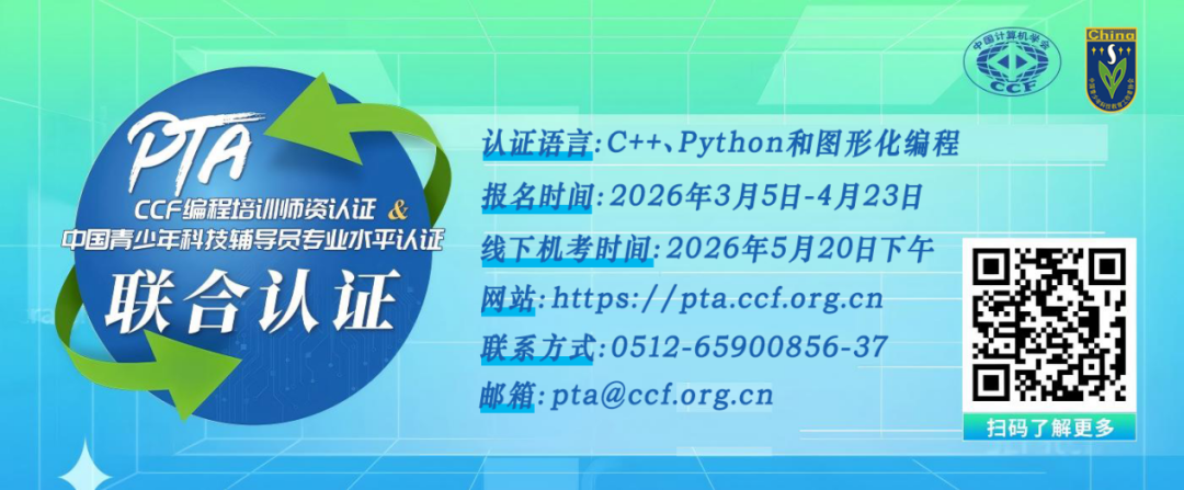 编程培训师资认证(PTA)第十次联合认证正在火热报名中,报名通道已于3月5日17时开启,将于4月23日24时关闭。其中T1和P科目将于5月20日下午在全国各城市线下考点上机考试,考生可根据自身情况在认证系统选择PTA考点参加认证。温馨提醒:报名时间已过半,请大家尽快登录CCF PTA网站(https://pta.ccf.org.cn/)进行报名,机位先到先得,欲报从速!